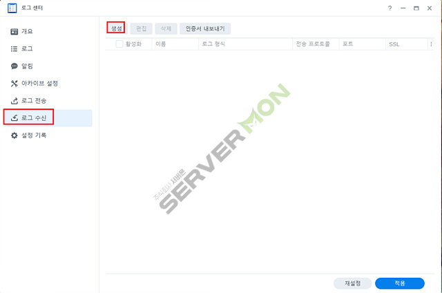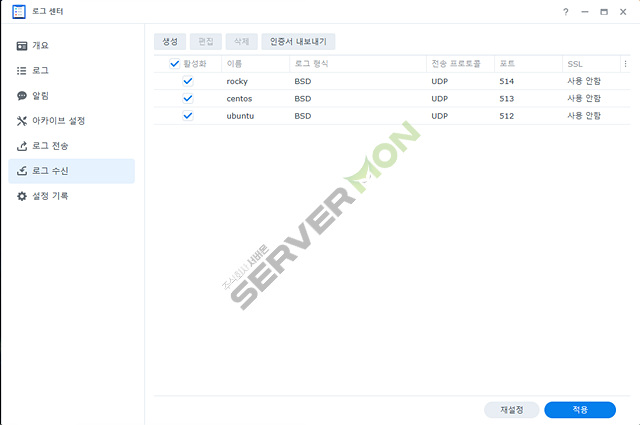 2. 로그 수신탭에서 로그 수집에 필요한 서버들에 대해 설정해줍니다.