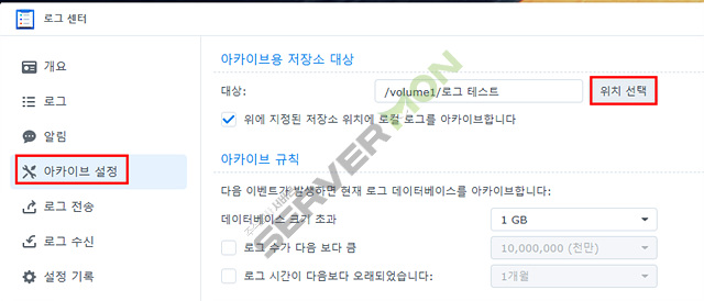 1. NAS에 로그인을 하고 로그센터를 실행하여 아카이브 설정 탭에서 저장소를 지정해줍니다.