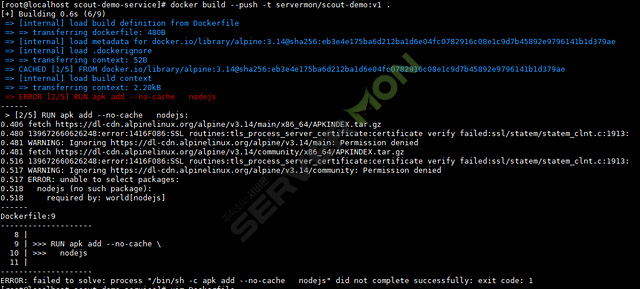 ERROR: failed to solve: process "/bin/sh -c apk add --no-cache nodejs" did not complete successfully: exit code: 1