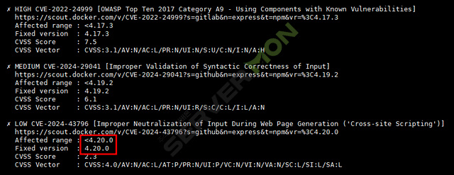 Scout는 CVE DB와 연동해 패키지 단위로 취약점을 정리하며, 심각도 및 권고 사항을 함께 제공합니다.