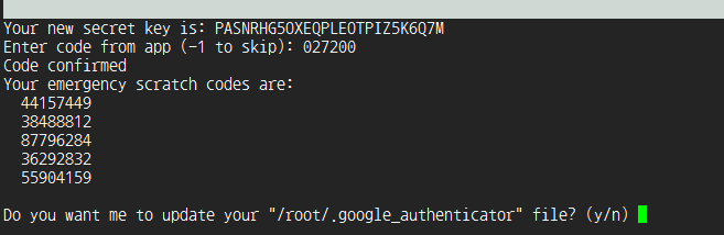 `y`를 입력하면 앞서 생성된 OTP 정보와 백업 코드가