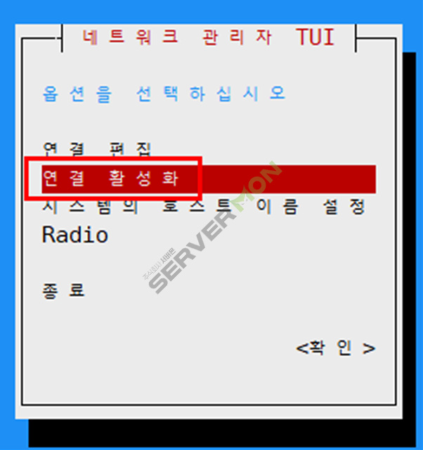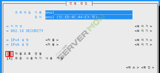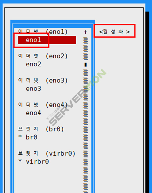 nmtui 메뉴에서 연결 활성화 선택 후 연결된 기존 이더넷(eno1) 을 비활성화 해줍니다. (사진과 같이 * 이 없어져야 비활성화가 된것입니다.)