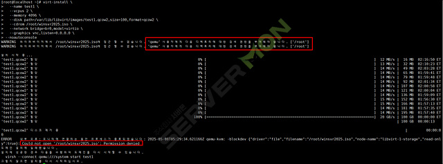 Libvirt는 가상머신 생성시 qemu 사용자 권한으로 실행합니다. 해당 사용자는 root 디렉토리에 대한 접근 권한이 제한되어 있습니다.
