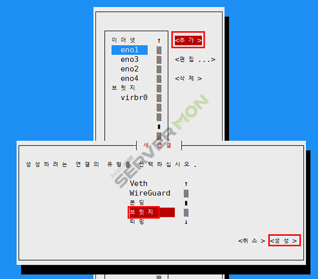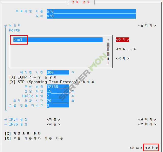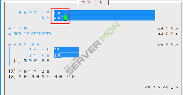 1) 연결편집 – 기존 이더넷(eno1) 선택