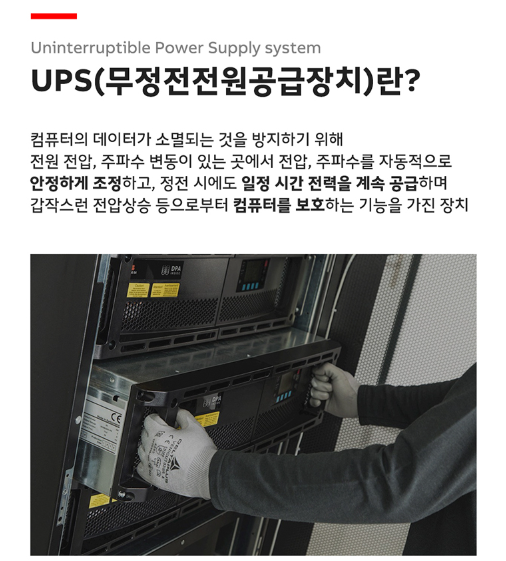 UPS(Uninterruptible Power Supply, 무정전 전원장치)는 전력 공급에 이상이 생겼을 때 중요한 전자장비에 끊김 없는 전력을 공급하는 장치입니다. 통신 서버, 컴퓨터, LAN 노드 등과 같이 전원이 반드시 유지되어야 하는 시스템의 안정적인 운영을 위해 필수적으로 사용됩니다.