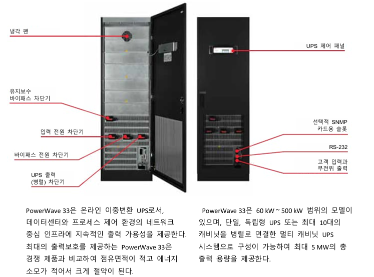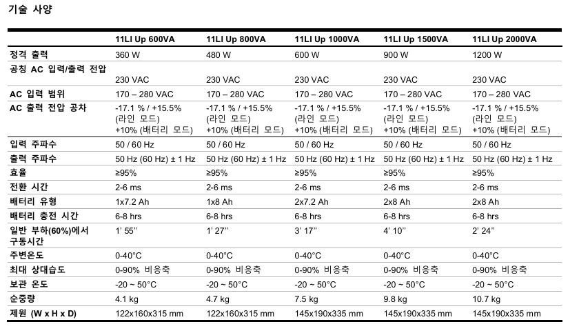 | 모델명 | UPS 방식 | 타입 | 정격 용량 | 입력 | 출력 | 주요 특징 |