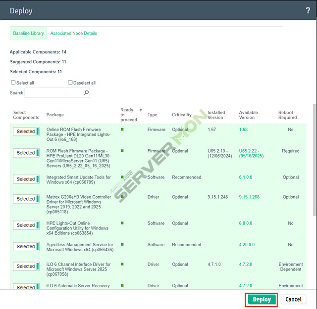 업데이트가 필요한 서버는 노란색으로 표기되고 Review and deploy updates를 선택 후 업데이트 되는 패키지들을 확인한 후 deploy를 눌러주면 업데이트가 진행됩니다.