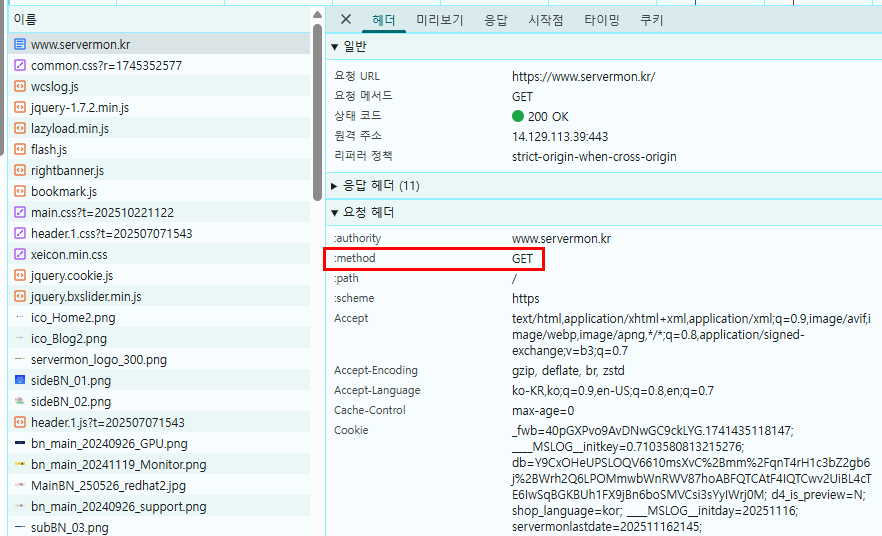 HTTP 헤더에는 키값 쌍에 저장된 텍스트 정보가 포함되어 있으며 헤더는 모든 HTTP 요청에 포함됩니다.