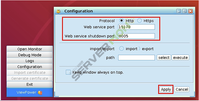 11 - Configuration 클릭 후 아래 와 같이 Web service port 를 설정 할수 있는 창이 출력 됩니다.