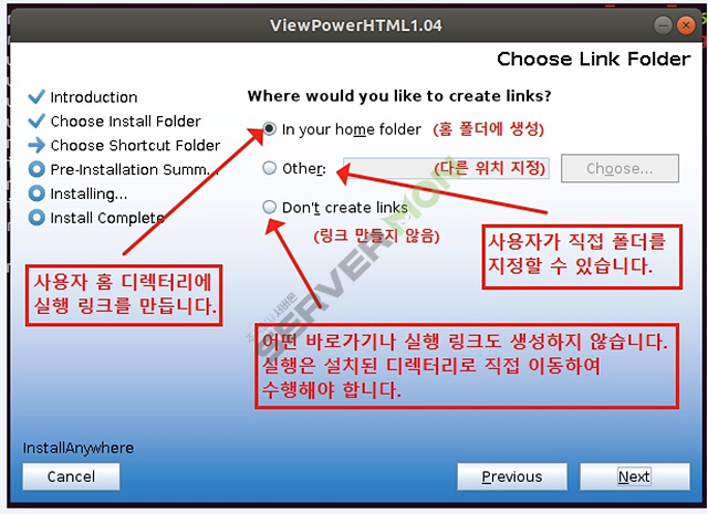 6 - 설치된 프로그램의 실행 링크 위치를 선택하는 단계입니다. home folder 로 지정하였습니다.