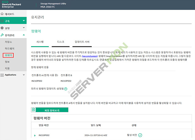 컨트롤러/드라이브 펌웨어를 수동 또는 업데이트서버를 통해 자동 업데이트 설정을 할 수 있습니다.