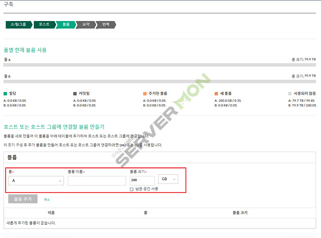 풀(A or B)을 선택하고 볼륨이름과 크기를 설정하여 추가해줍니다.