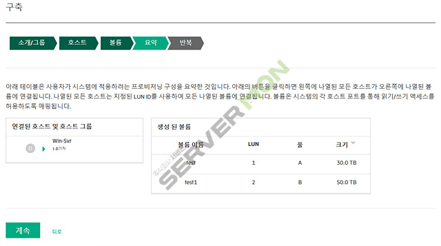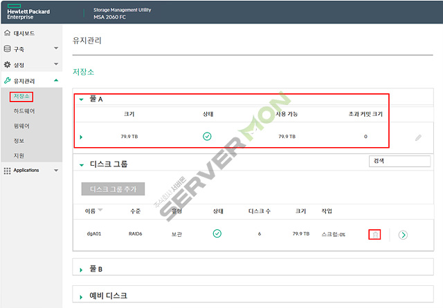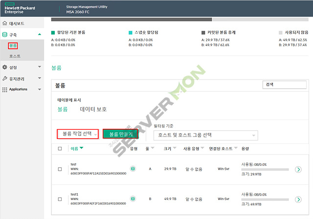 풀(A,B)에 대한 볼륨 구성 및 확인이 가능하며, 새로운 LUN 생성 및 서버 연결시 매핑 관리를 합니다.