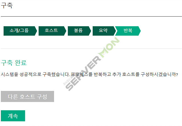 구축완료를 보여주고, 이전에 하였던 탭들을 다시 반복적으로 할것인지를 물어보는 탭 입니다.