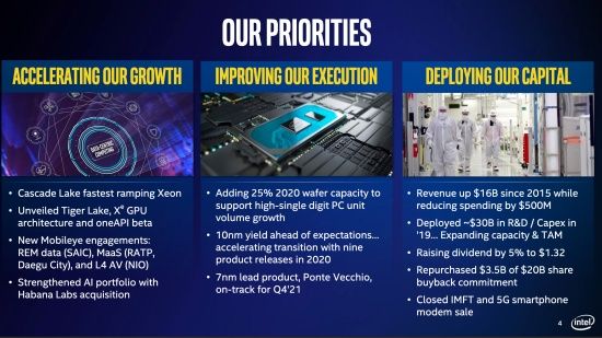 인텔은 23일(현지시각) 진행된 2019년 4분기 실적발표에서 올해 85억 달러(약 8조 6천억원) 이상을 생산 시설 확충과 차세대 공정을 위한 장비 구매에 투자한다고 밝혔다.