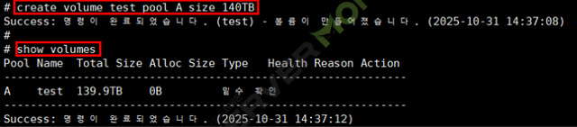 create volume [볼륨이름] pool [A,B] size [볼륨구성크기]