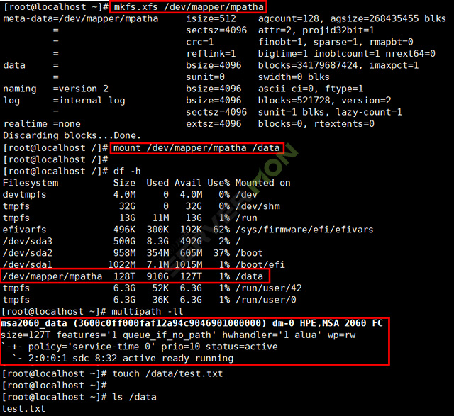 multipath로 구성된 파티션을 포맷하고 /data에 마운트 합니다.