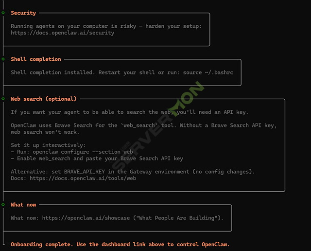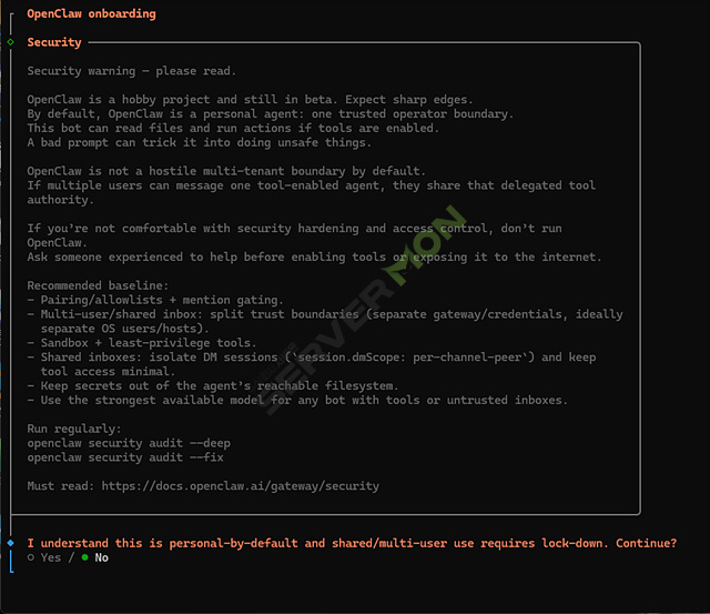 설치가 완료되면 openclaw 보안 경고문이 생성됩니다.