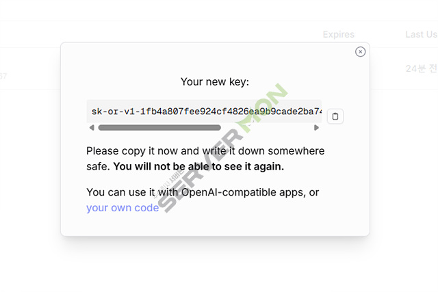 생성된 API 키는 다시는 볼수 없으니 잘 보관 합니다.생성한 API 를 붙혀 넣고 진행합니다.