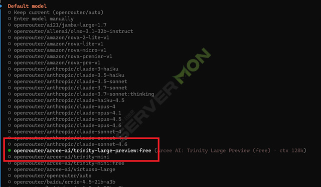 Arcee AI 의 Trinity Large Preview (free) 로 설정해보겠습니다.