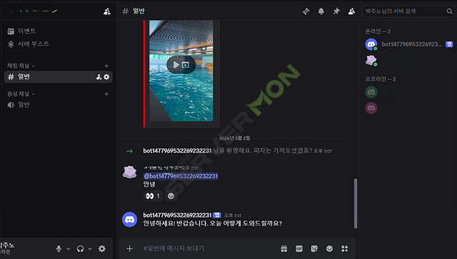 초대한 채널에서 @봇이름 을 통해 대화를 할 수 있습니다.