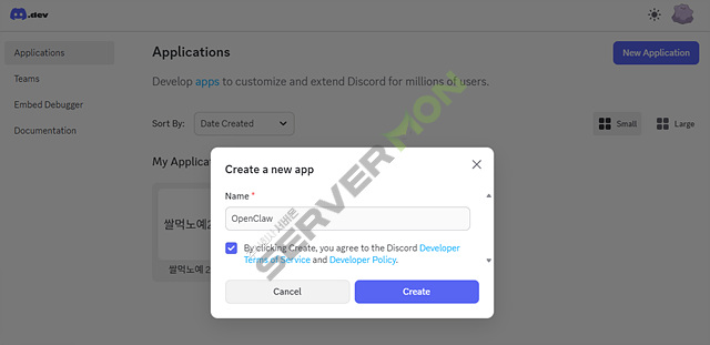 Discord Developer Portal에 접속하여 'New Application'을 만듭니다.
