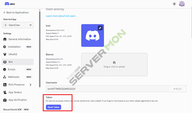 'Bot' 메뉴로 이동하여 'Reset Token'을 눌러 토큰을 복사합니다.