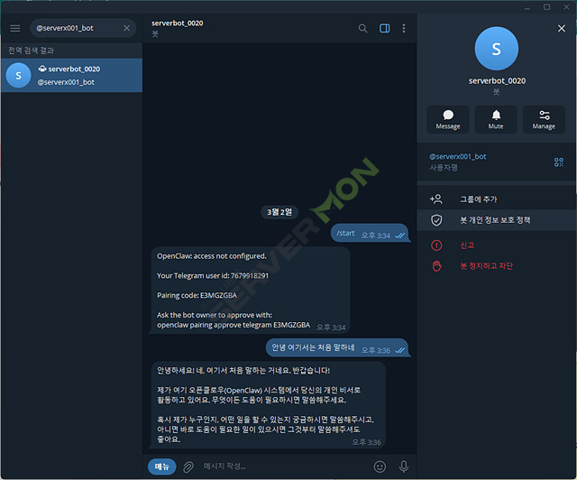 봇이 "Pairing code: 123456" 같은 코드를 답장으로 보냅니다.