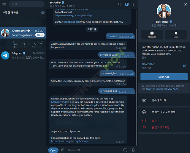 텔레그램에서 @BotFather를 검색하여 대화를 시작하고 /newbot을 입력합니다.