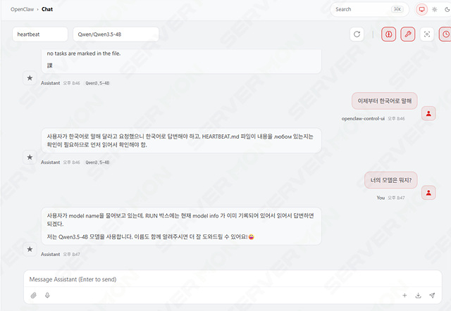 웹 브라우저를 통해 http://127.0.0.1:18789/ 에 접속하여 신규 추가한 모델과 대화를 하였습니다.